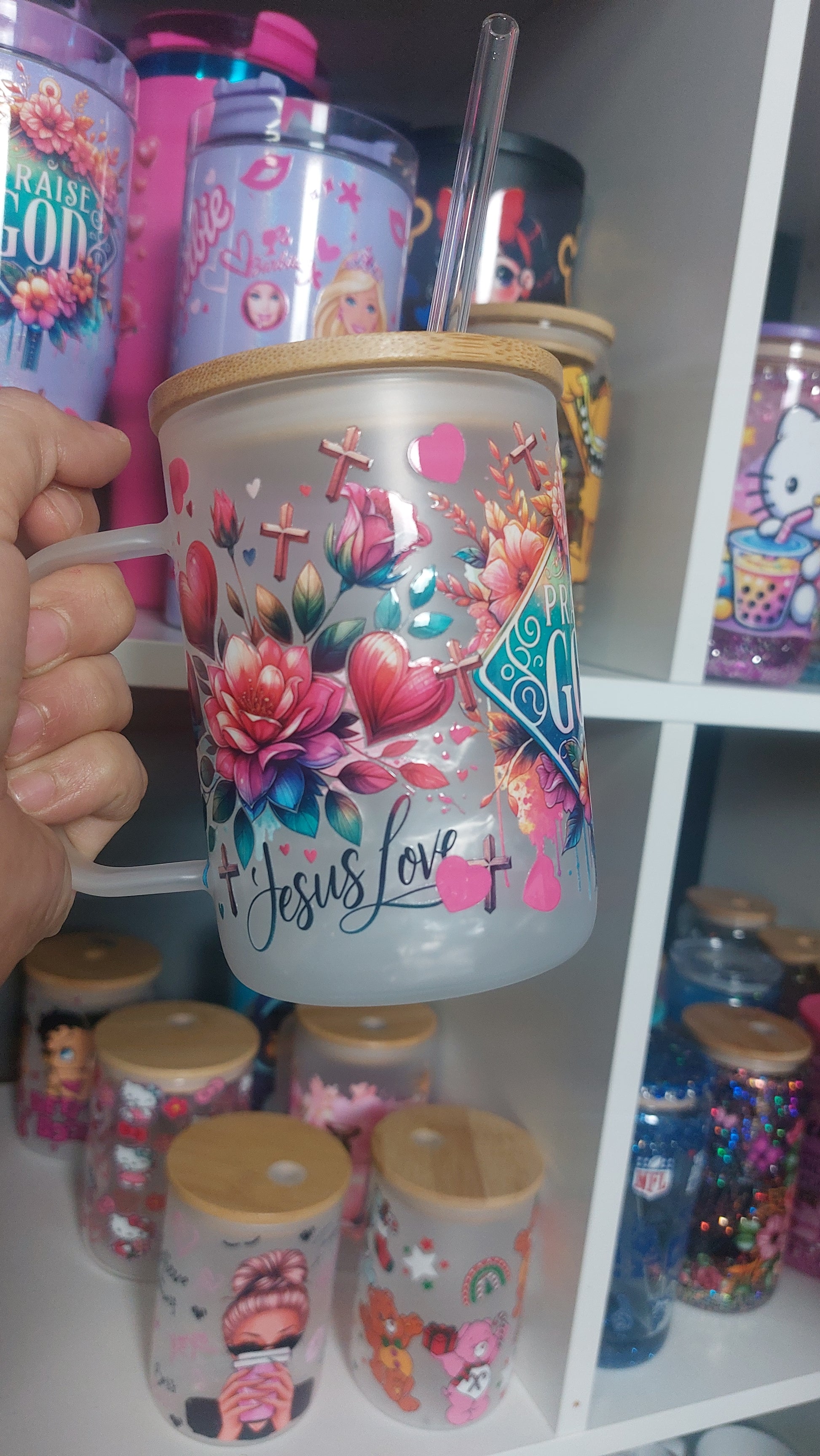 Praise God 17oz Glass handle with lid & straw