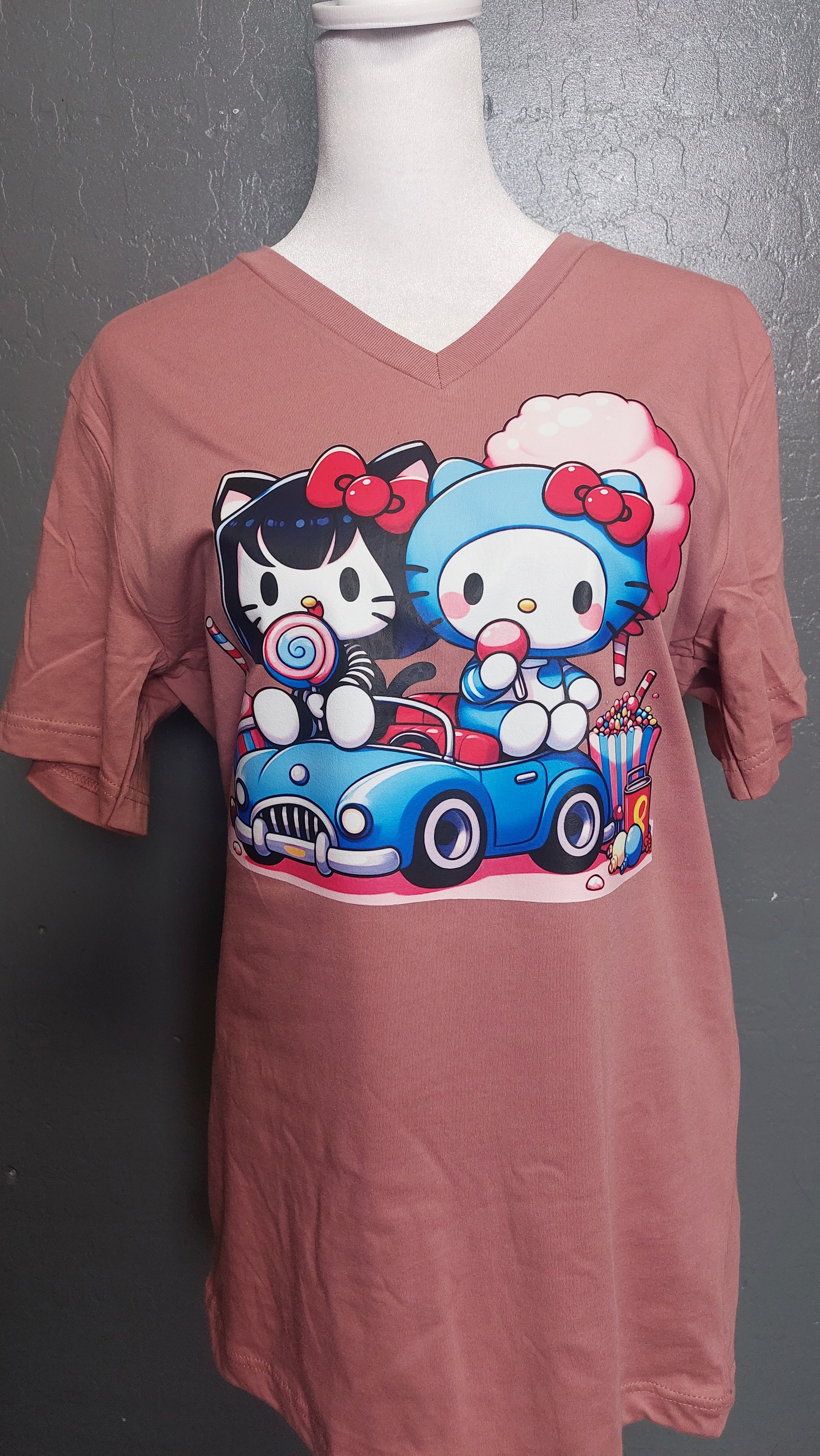 Our V-neck UNISEX  T-shirt is the cutest option for everyday use and is ready to ship. All shirts are made with a DTF design and heat press.